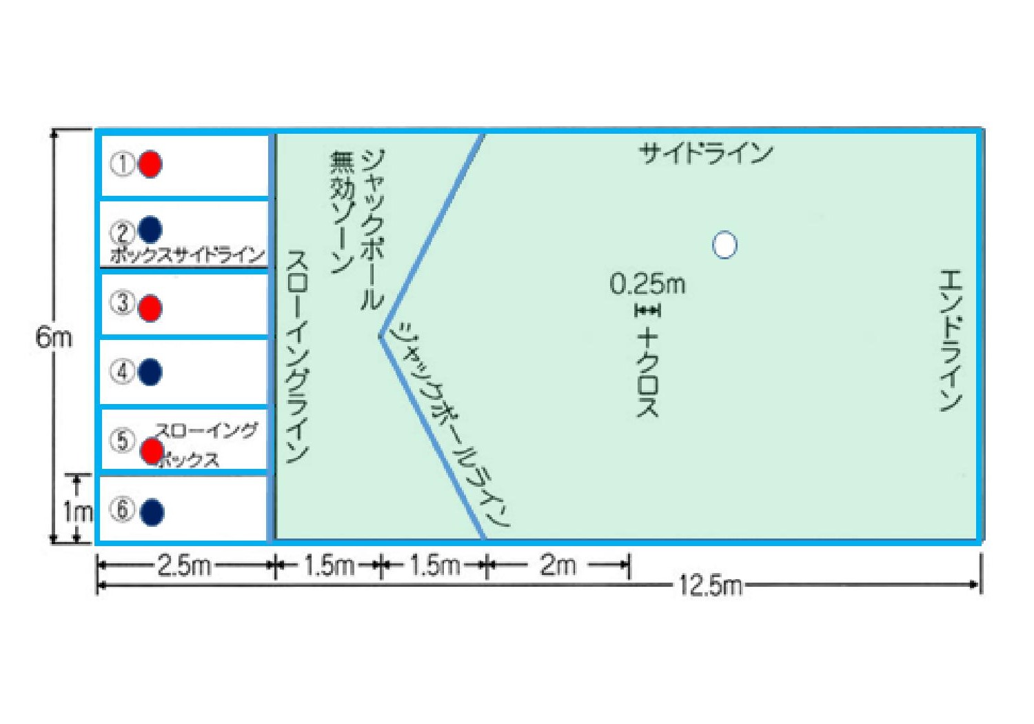 競技するコートの基準は以下のとおりですが、競技者は①~⑥のエリア内からボールを投げます。①、③、⑤は赤ボールチーム。②、④、⑥は青ボールチーム。ゲームの最初にコイントスで赤又は青を選び、赤ボールチームが先攻となり、ジャック(jack)と呼ばれる的球(まとだま)を投げます。ジャックボールは、コートにV字型に引かれたジャックボールラインを越えなければなりません。続いて1巡目の投球はジャックボールを投げた側の先行、次に相手側の順でジャックボールに向けてボールを転がします。2巡目以降ボールが尽きるまでの投球は、ジャックボールに遠いボールを投げたサイドが、相手チームよりも近いボールを投げられるまで連続して投球を行う。