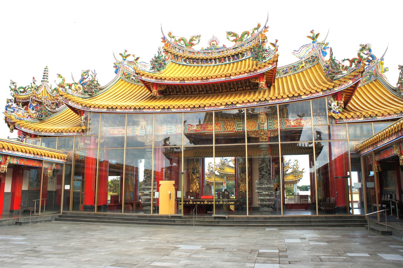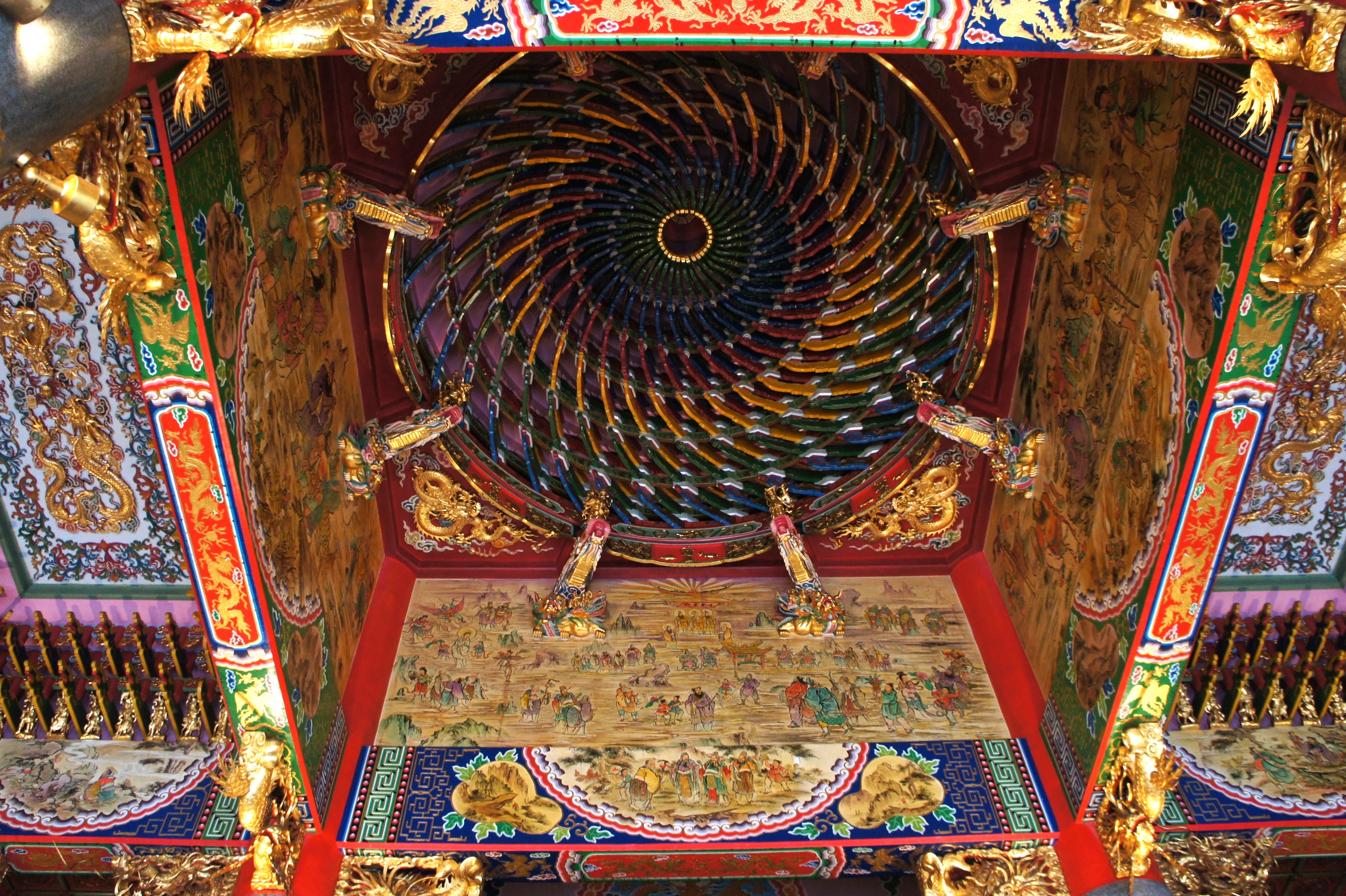 聖天宮(せいてんきゅう)は中国(含台湾)の「道教」のお宮で、日々の道徳を重んじ、善行に報いてくれる最高神「三清道祖」が祀られています。ここを拓いたのは台湾出身の貿易商康國典大法師で不治の大病が治癒したことの感謝と、何人(なんびと)にもこの神様のご利益にあやかれるようにと私財を投じ15年かけて平成7年に開廟したそうです。五千頭の龍が昇ると冠している通り、門・柱・天井等随所に「龍」があしらわれていて、赤と黄(金)を主体とした色調と相俟って異国情緒満載です。